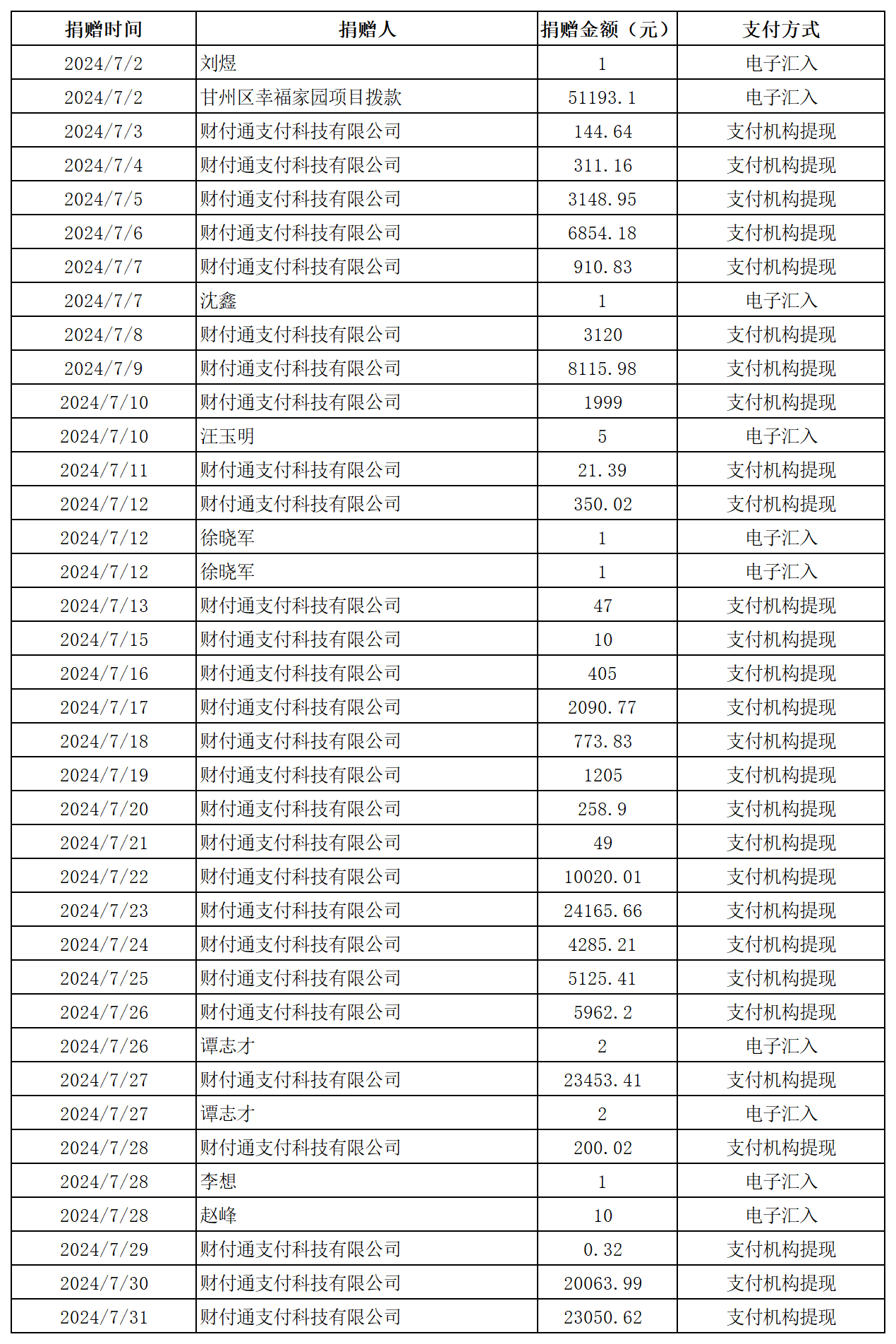 2024年張掖市慈善協(xié)會積極搭建愛心平臺,得到廣大愛心人士和愛心單位積極響應,踴躍捐款捐物,現(xiàn)將(2024年7月1日--7月31日)接收到的銀行轉(zhuǎn)賬收入公示如下: